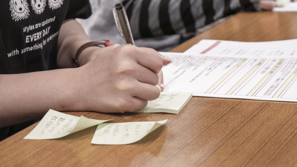 発表の後は、「伝えたいことは本当に伝わるのか?」「素材は何を選ぶべきか?」といった議論が続きます。前回は恐れずに指摘をすることを促しましたが、それだと個人感の指摘となってしまうので、今回からは付箋を用いた発言方法に方針変換。互いに支え合いながら率直な言葉を交わすことができました。