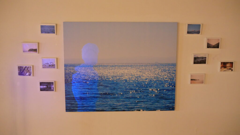 病で亡くした恋人との旅の思い出を振り返るキャンバス作品群。中央の海のキャンバスにはブラックライトでふわりと浮かび上がる人の影が存在します。しかし明滅するライトによりそれは見えなくなり、代わりに鑑賞者の影が残る…そんな、そばにいるけれど触れられない、それでも確かにある存在を感じる作品でした。