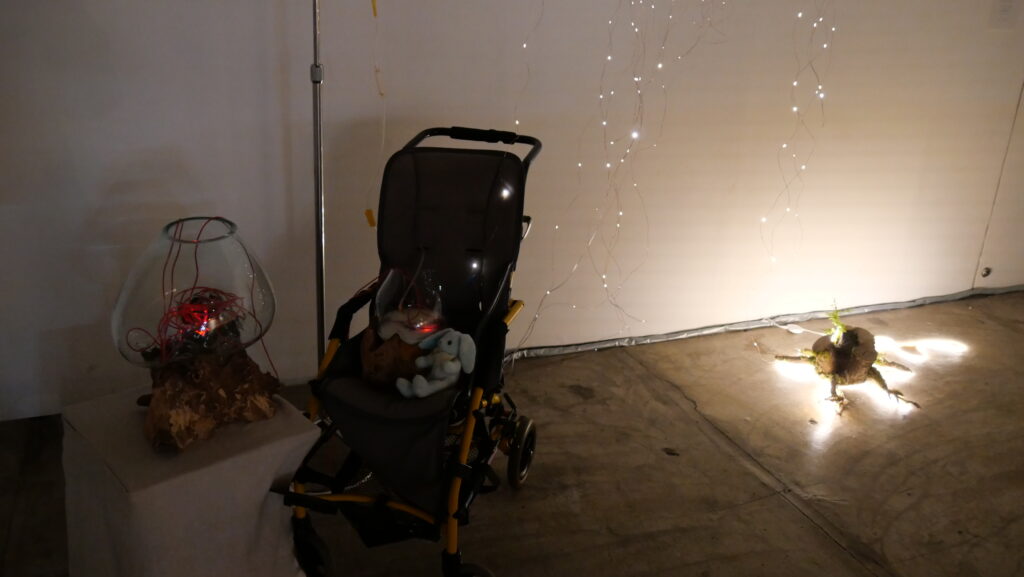 病を抱えたお子さんの生前の姿を思わせる、光が脈動するインスタレーション。「つながり」という言葉を、もっとも切実なかたちで問い直す試みです。併設された《Preserving》では、シャーレに思いを込めた小さな花のアレンジを制作するワークショップを実施。参加者の思いが可視化されていくようでした。