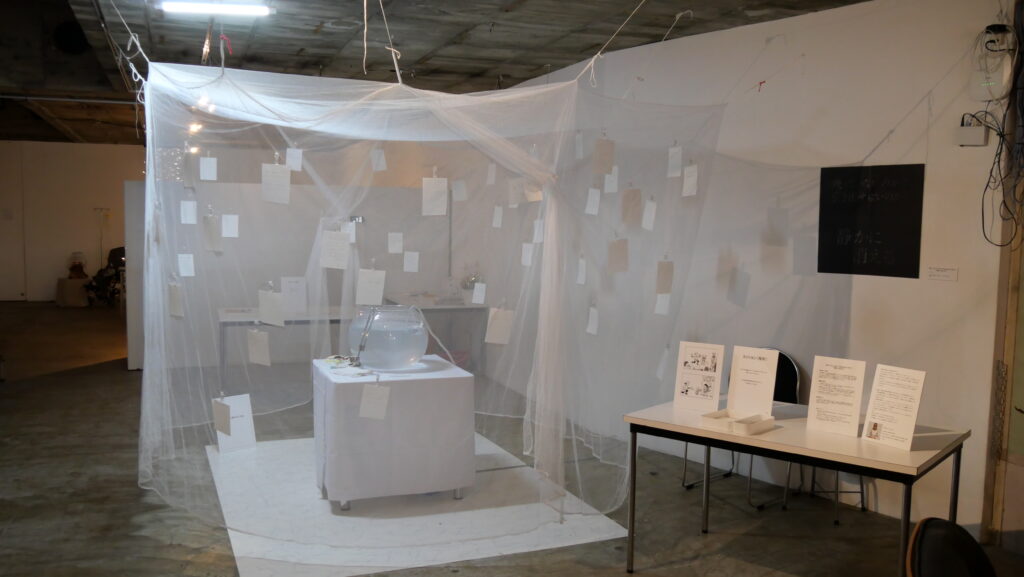 白い蚊帳の向こうで揺れる金魚鉢。与えられたミッションに従って観客が書いた言葉を沈めるたび、小さな驚きの声が上がります。金魚鉢の中で一瞬で消えてしまった言葉は、記憶という目に見えない機能を失った家族の追体験です。それは、忘却の痛みではなく、曖昧さそのものを受け止めるような時間でした。