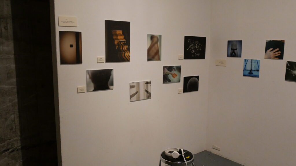 3面に写真を並べ、それぞれにテーマが与えられた作品群。椅子に置かれた音声プレイヤーからは、テーマに合わせた音楽や語りが流れてきます。鑑賞者が椅子に座ると、「ほどけた糸」がそっと浮かび上がります。喪失を癒すのではなく、抱きしめる場所として、多くの来場者が長く座り込んでいました。